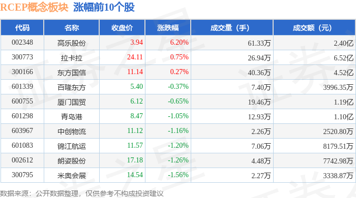 从资金流向上来看,当日RCEP概念板块主力资金净流出1.66亿元,游资资金净流入7352.05万元,散户资金净流入9247.77万元。RCEP概念板块个股资金流向见下表: