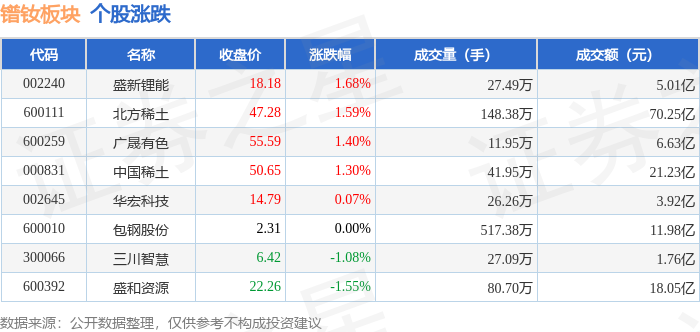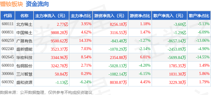 从资金流向上来看,当日镨钕板块主力资金净流入4.6亿元,游资资金净流入1.37亿元,散户资金净流出5.97亿元。镨钕板块个股资金流向见下表: