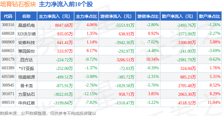 从资金流向上来看,当日培育钻石板块主力资金净流出3.49亿元,游资资金净流出4803.24万元,散户资金净流入3.97亿元。培育钻石板块个股资金流向见下表: