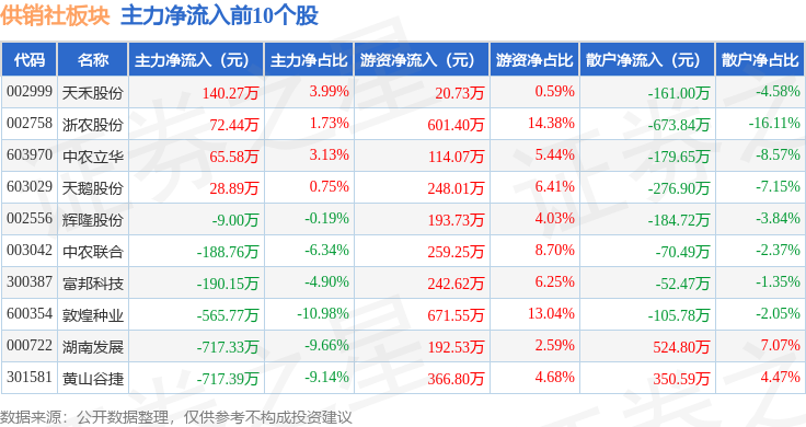 从资金流向上来看,当日供销社板块主力资金净流出2.59亿元,游资资金净流入8995.27万元,散户资金净流入1.69亿元。供销社板块个股资金流向见下表: