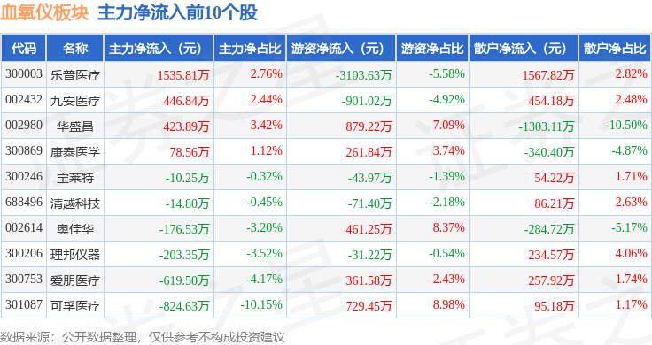 从资金流向上来看,当日血氧仪板块主力资金净流出7875.15万元,游资资金净流出378.65万元,散户资金净流入8253.8万元。血氧仪板块个股资金流向见下表: