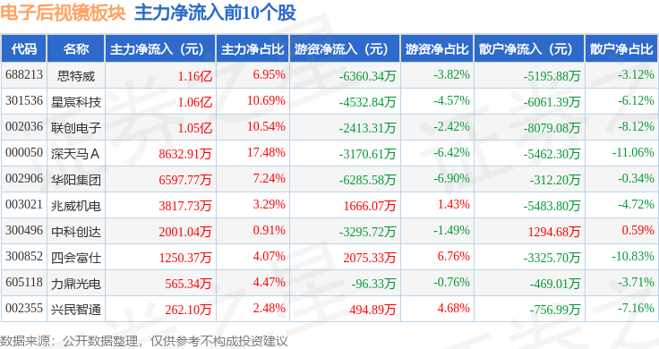 从资金流向上来看,当日电子后视镜板块主力资金净流出20.6亿元,游资资金净流入6.94亿元,散户资金净流入13.67亿元。电子后视镜板块个股资金流向见下表: