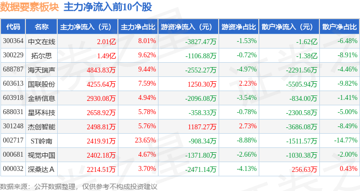 从资金流向上来看,当日数据要素板块主力资金净流出12.06亿元,游资资金净流入1.66亿元,散户资金净流入10.4亿元。数据要素板块个股资金流向见下表: