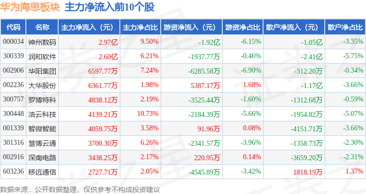 从资金流向上来看,当日华为海思板块主力资金净流出23.25亿元,游资资金净流入5.06亿元,散户资金净流入18.19亿元。华为海思板块个股资金流向见下表: