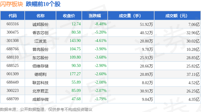 证券之星消息,9月25日闪存板块较上一交易日下跌0.52%,诚邦股份领跌。当日上证指数报收于3853.3,下跌0.01%。深证成指报收于13445.9,上涨0.67%。闪存板块个股涨跌见下表: