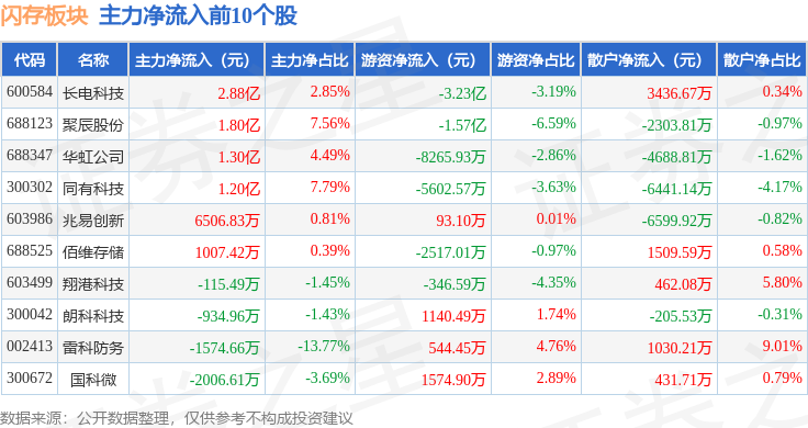 从资金流向上来看,当日闪存板块主力资金净流出21.81亿元,游资资金净流入7812.37万元,散户资金净流入21.02亿元。闪存板块个股资金流向见下表: