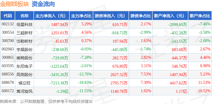 从资金流向上来看,当日金刚线板块主力资金净流出2.29亿元,游资资金净流入6468.33万元,散户资金净流入1.65亿元。金刚线板块个股资金流向见下表: