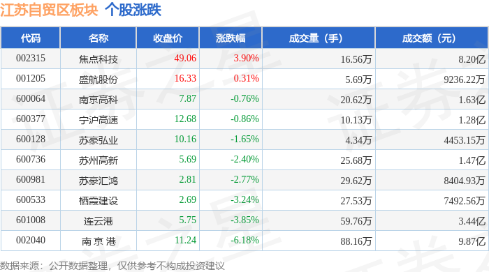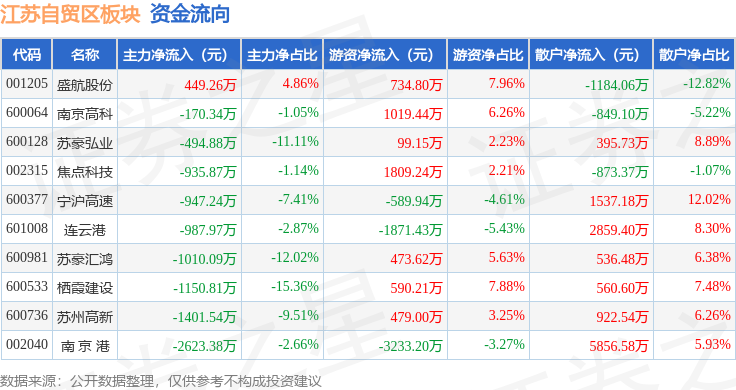 从资金流向上来看,当日江苏自贸区板块主力资金净流出9272.84万元,游资资金净流出489.13万元,散户资金净流入9761.97万元。江苏自贸区板块个股资金流向见下表: