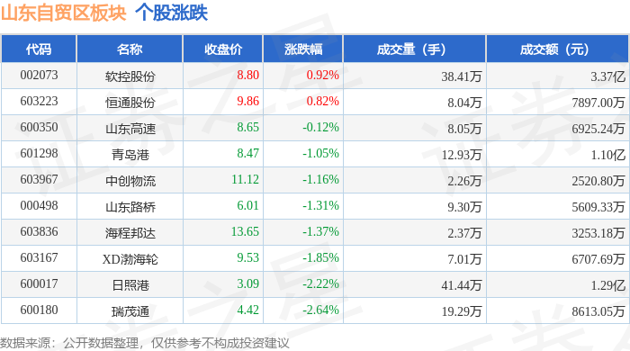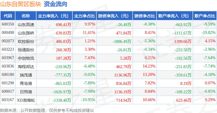 从资金流向上来看,当日山东自贸区板块主力资金净流出2034.04万元,游资资金净流入2925.04万元,散户资金净流出891.0万元。山东自贸区板块个股资金流向见下表: