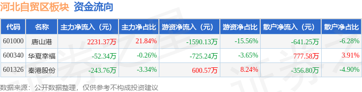 从资金流向上来看,当日河北自贸区板块主力资金净流入1935.27万元,游资资金净流出1714.8万元,散户资金净流出220.47万元。河北自贸区板块个股资金流向见下表: