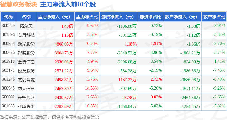从资金流向上来看,当日智慧政务板块主力资金净流出12.58亿元,游资资金净流入2.86亿元,散户资金净流入9.72亿元。智慧政务板块个股资金流向见下表: