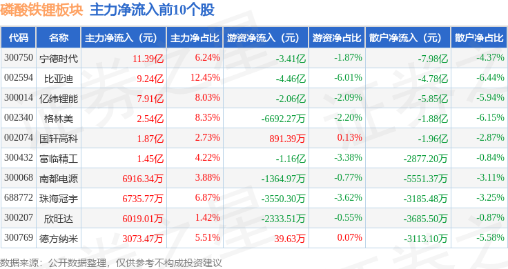 从资金流向上来看,当日磷酸铁锂板块主力资金净流入23.07亿元,游资资金净流出9.8亿元,散户资金净流出13.27亿元。磷酸铁锂板块个股资金流向见下表: