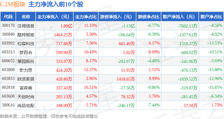 从资金流向上来看,当日C2M板块主力资金净流出5.07亿元,游资资金净流入1.68亿元,散户资金净流入3.39亿元。C2M板块个股资金流向见下表: