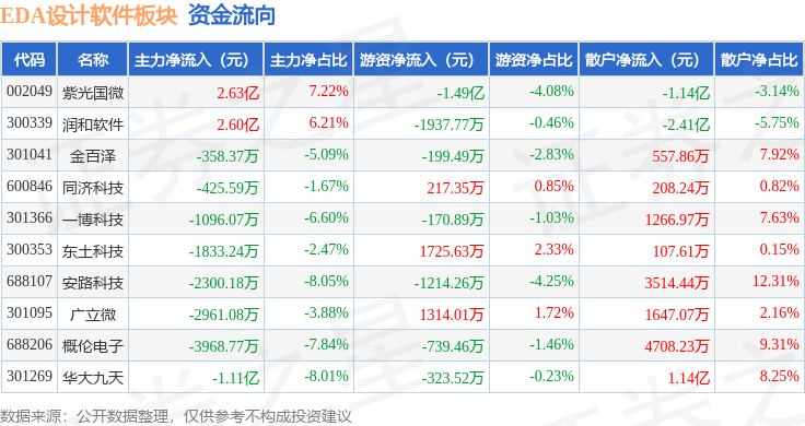 从资金流向上来看,当日EDA设计软件板块主力资金净流入2.84亿元,游资资金净流出1.62亿元,散户资金净流出1.22亿元。EDA设计软件板块个股资金流向见下表: