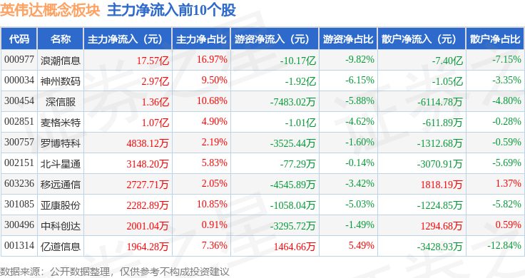 从资金流向上来看,当日英伟达概念板块主力资金净流出10.43亿元,游资资金净流出5.02亿元,散户资金净流入15.45亿元。英伟达概念板块个股资金流向见下表: