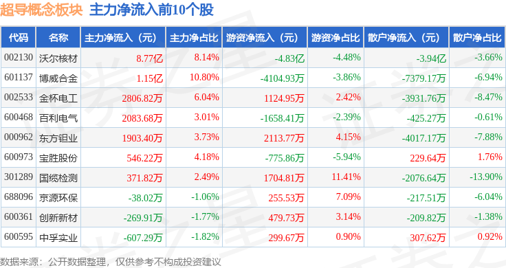 从资金流向上来看,当日超导概念板块主力资金净流入4.75亿元,游资资金净流出2.54亿元,散户资金净流出2.21亿元。超导概念板块个股资金流向见下表: