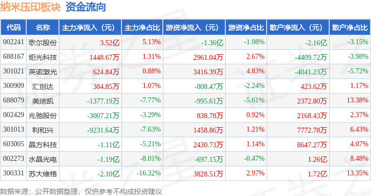 从资金流向上来看,当日纳米压印板块主力资金净流出2.01亿元,游资资金净流出1123.05万元,散户资金净流入2.12亿元。纳米压印板块个股资金流向见下表: