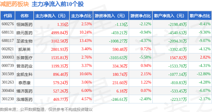 从资金流向上来看,当日减肥药板块主力资金净流出5.07亿元,游资资金净流出3247.66万元,散户资金净流入5.39亿元。减肥药板块个股资金流向见下表: