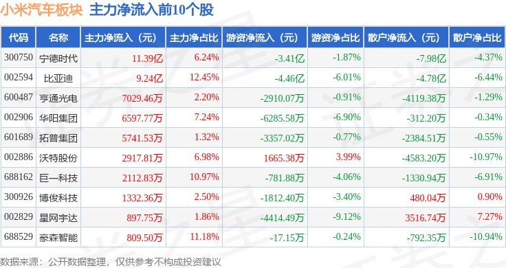 从资金流向上来看,当日小米汽车板块主力资金净流入10.68亿元,游资资金净流出6.57亿元,散户资金净流出4.11亿元。小米汽车板块个股资金流向见下表: