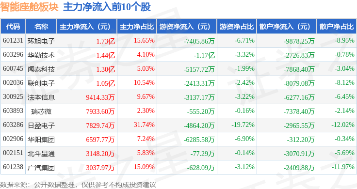 从资金流向上来看,当日智能座舱板块主力资金净流出10.58亿元,游资资金净流入1039.82万元,散户资金净流入10.47亿元。智能座舱板块个股资金流向见下表: