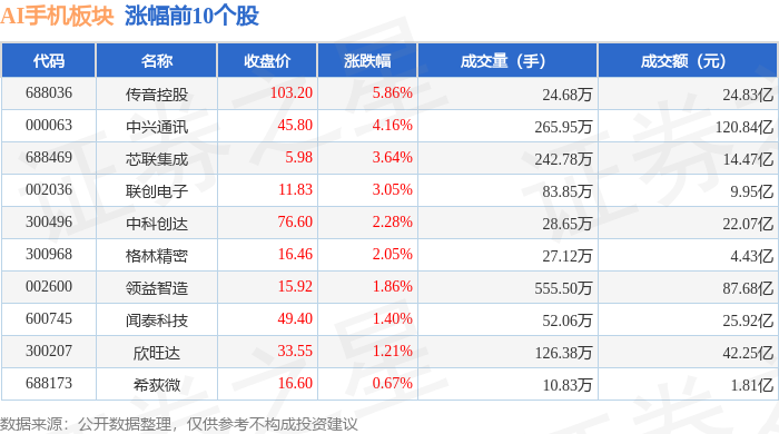 从资金流向上来看,当日AI手机板块主力资金净流入4.82亿元,游资资金净流出9.55亿元,散户资金净流入4.73亿元。AI手机板块个股资金流向见下表: