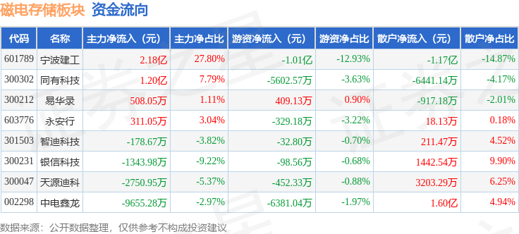 从资金流向上来看,当日磁电存储板块主力资金净流入2.08亿元,游资资金净流出2.26亿元,散户资金净流入1882.93万元。磁电存储板块个股资金流向见下表: