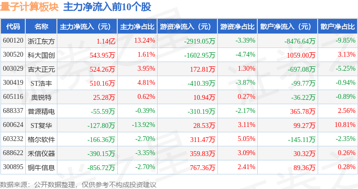 从资金流向上来看,当日量子计算板块主力资金净流出2.64亿元,游资资金净流入9449.05万元,散户资金净流入1.69亿元。量子计算板块个股资金流向见下表: