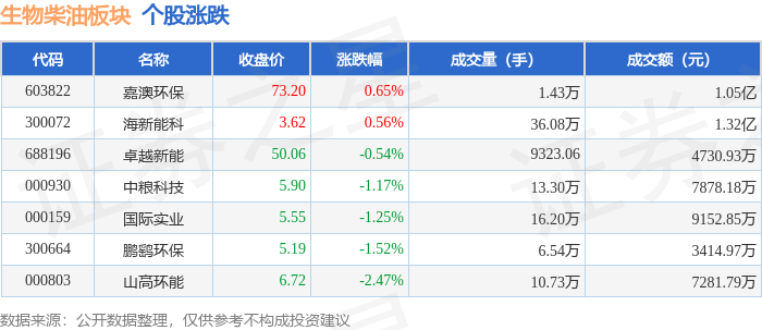 证券之星消息,9月25日生物柴油板块较上一交易日下跌0.61%,山高环能领跌。当日上证指数报收于3853.3,下跌0.01%。深证成指报收于13445.9,上涨0.67%。生物柴油板块个股涨跌见下表: