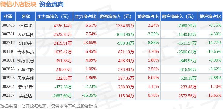 从资金流向上来看,当日微信小店板块主力资金净流入8863.67万元,游资资金净流入3057.14万元,散户资金净流出1.19亿元。微信小店板块个股资金流向见下表: