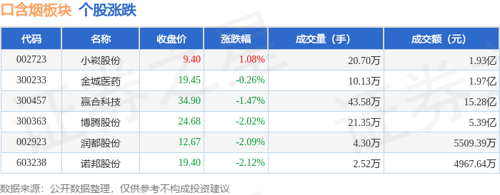 证券之星消息,9月25日口含烟板块较上一交易日下跌1.37%,诺邦股份领跌。当日上证指数报收于3853.3,下跌0.01%。深证成指报收于13445.9,上涨0.67%。口含烟板块个股涨跌见下表:
