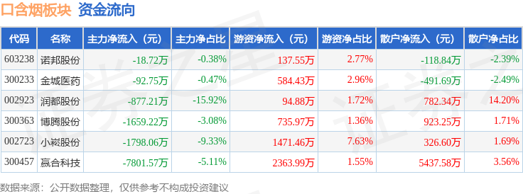 从资金流向上来看,当日口含烟板块主力资金净流出1.22亿元,游资资金净流入5388.29万元,散户资金净流入6859.25万元。口含烟板块个股资金流向见下表: