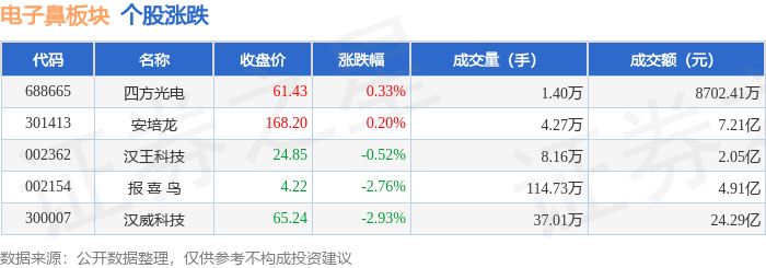 证券之星消息,9月25日电子鼻板块较上一交易日下跌1.52%,汉威科技领跌。当日上证指数报收于3853.3,下跌0.01%。深证成指报收于13445.9,上涨0.67%。电子鼻板块个股涨跌见下表:
