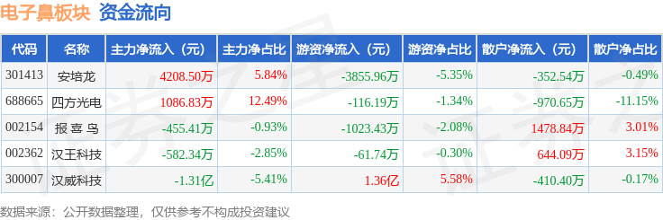 从资金流向上来看,当日电子鼻板块主力资金净流出8889.29万元,游资资金净流入8499.94万元,散户资金净流入389.34万元。电子鼻板块个股资金流向见下表: