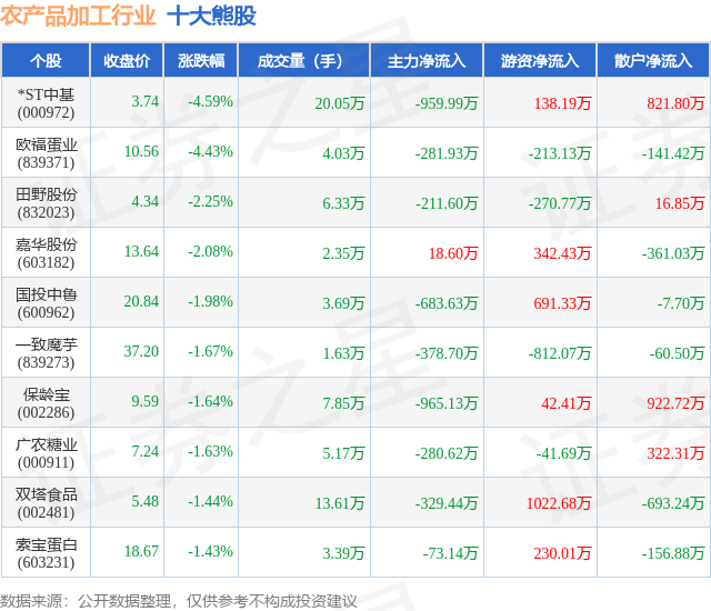 个股表现方面,农产品加工行业当日领跌股为*ST中基(000972),该股当日报收3.74,下跌4.59%,成交量20.05万,主力资金净流出959.99万元。欧福蛋业(839371)以下跌4.43%紧随其后,该股当日成交量4.03万,主力资金净流出281.93万元。除此之外,田野股份(832023)、嘉华股份(603182)、国投中鲁(600962)均进入当日熊股之列。具体个股列表见下表: