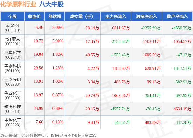 个股表现方面,化学原料行业当日领涨股为新金路(000510),该股当日报收5.46,上涨5.0%,成交量78.14万,主力资金净流入6811.67万元。*ST亚太(000691)以上涨5.0%紧随其后,该股当日成交量17.35万,主力资金净流出2756.68万元。除此之外,卫星化学(002648)、善水科技(301190)、三孚股份(603938)均进入当日牛股之列。具体个股列表见下表:
