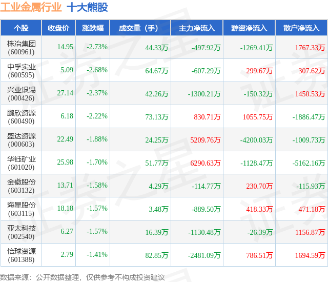 个股表现方面,工业金属行业当日领跌股为株冶集团(600961),该股当日报收14.95,下跌2.73%,成交量44.33万,主力资金净流出497.92万元。中孚实业(600595)以下跌2.68%紧随其后,该股当日成交量64.67万,主力资金净流出607.29万元。除此之外,兴业银锡(000426)、鹏欣资源(600490)、盛达资源(000603)均进入当日熊股之列。具体个股列表见下表: