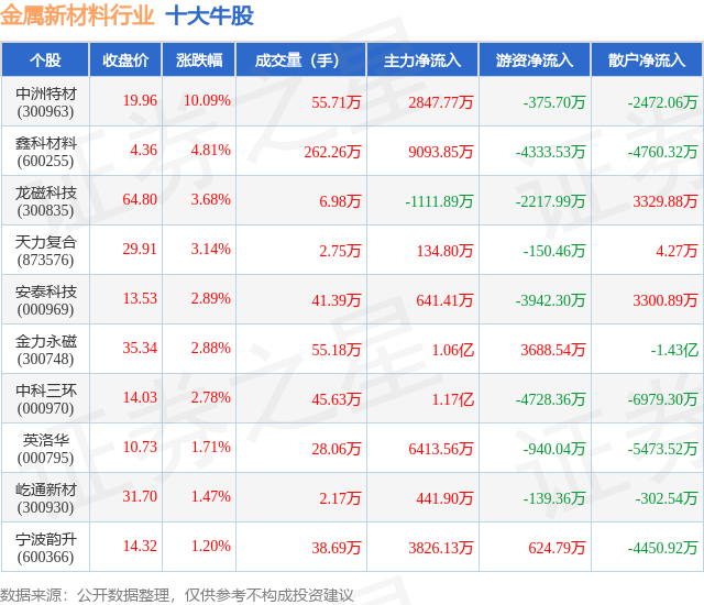 个股表现方面,金属新材料行业当日领涨股为中洲特材(300963),该股当日报收19.96,上涨10.09%,成交量55.71万,主力资金净流入2847.77万元。鑫科材料(600255)以上涨4.81%紧随其后,该股当日成交量262.26万,主力资金净流入9093.85万元。除此之外,龙磁科技(300835)、天力复合(873576)、安泰科技(000969)均进入当日牛股之列。具体个股列表见下表: