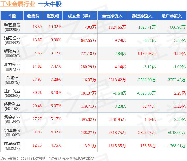 个股表现方面,工业金属行业当日领涨股为精艺股份(002295),该股当日报收13.5,上涨10.02%,成交量4.03万,主力资金净流入1824.66万元。洛阳钼业(603993)以上涨9.9%紧随其后,该股当日成交量647.55万,主力资金净流入9.79亿元。除此之外,铜陵有色(000630)、北方铜业(000737)、金诚信(603979)均进入当日牛股之列。具体个股列表见下表: