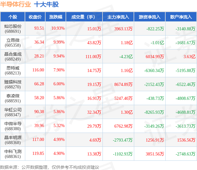 个股表现方面,半导体行业当日领涨股为灿芯股份(688691),该股当日报收93.51,上涨10.93%,成交量15.01万,主力资金净流入3963.13万元。立昂微(605358)以上涨9.99%紧随其后,该股当日成交量43.82万,主力资金净流入1.18亿元。除此之外,晶合集成(688249)、思特威(688213)、臻镭科技(688270)均进入当日牛股之列。具体个股列表见下表:
