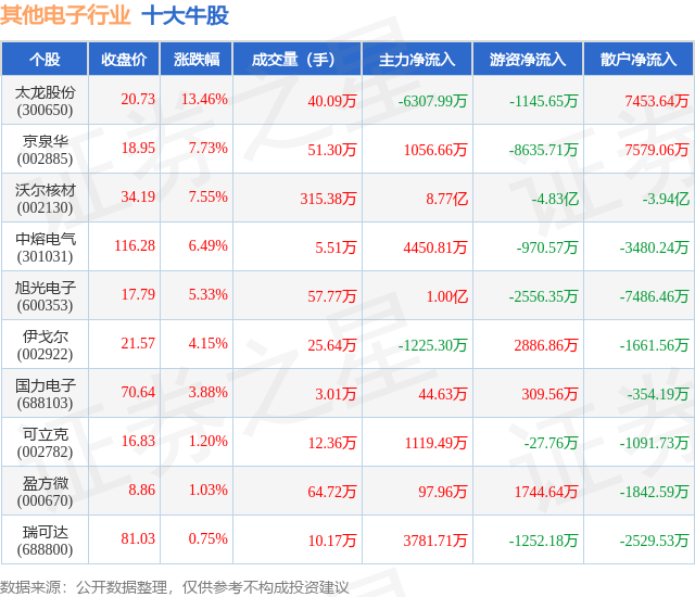 个股表现方面,其他电子行业当日领涨股为太龙股份(300650),该股当日报收20.73,上涨13.46%,成交量40.09万,主力资金净流出6307.99万元。京泉华(002885)以上涨7.73%紧随其后,该股当日成交量51.3万,主力资金净流入1056.66万元。除此之外,沃尔核材(002130)、中熔电气(301031)、旭光电子(600353)均进入当日牛股之列。具体个股列表见下表: