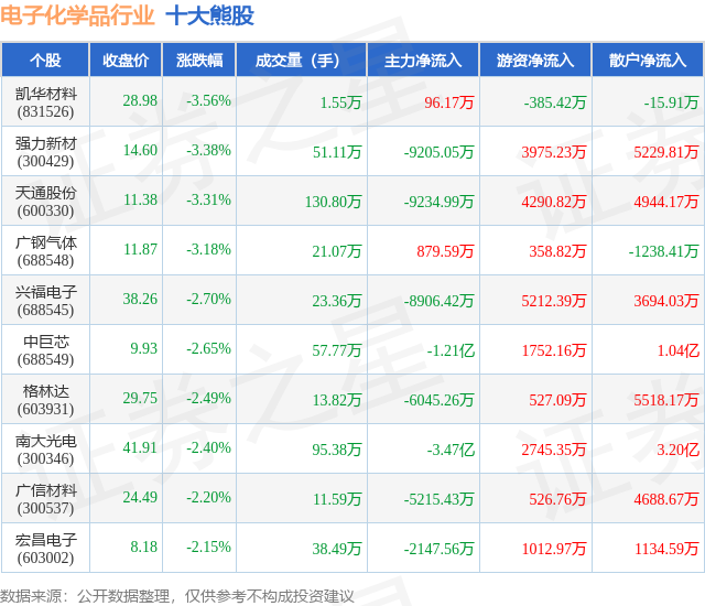 个股表现方面,电子化学品行业当日领跌股为凯华材料(831526),该股当日报收28.98,下跌3.56%,成交量1.55万,主力资金净流入96.17万元。强力新材(300429)以下跌3.38%紧随其后,该股当日成交量51.11万,主力资金净流出9205.05万元。除此之外,天通股份(600330)、广钢气体(688548)、兴福电子(688545)均进入当日熊股之列。具体个股列表见下表: