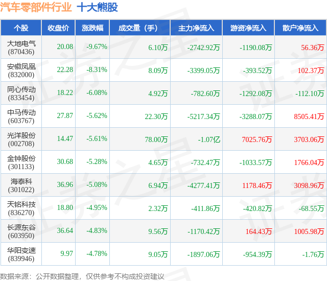 个股表现方面,汽车零部件行业当日领跌股为大地电气(870436),该股当日报收20.08,下跌9.67%,成交量6.1万,主力资金净流出2742.92万元。安徽凤凰(832000)以下跌8.31%紧随其后,该股当日成交量8.09万,主力资金净流出3399.05万元。除此之外,同心传动(833454)、中马传动(603767)、光洋股份(002708)均进入当日熊股之列。具体个股列表见下表: