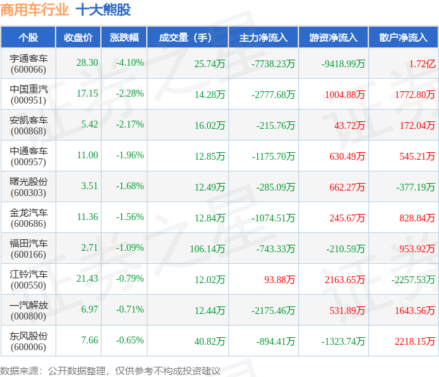 个股表现方面,商用车行业当日领跌股为宇通客车(600066),该股当日报收28.3,下跌4.1%,成交量25.74万,主力资金净流出7738.23万元。中国重汽(000951)以下跌2.28%紧随其后,该股当日成交量14.28万,主力资金净流出2777.68万元。除此之外,安凯客车(000868)、中通客车(000957)、曙光股份(600303)均进入当日熊股之列。具体个股列表见下表: