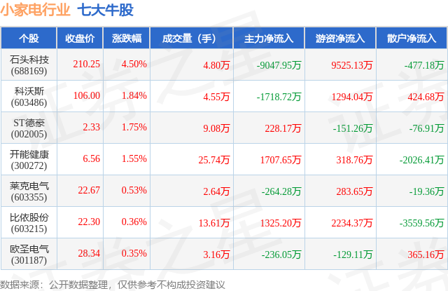 个股表现方面,小家电行业当日领涨股为石头科技(688169),该股当日报收210.25,上涨4.5%,成交量4.8万,主力资金净流出9047.95万元。科沃斯(603486)以上涨1.84%紧随其后,该股当日成交量4.55万,主力资金净流出1718.72万元。除此之外,ST德豪(002005)、开能健康(300272)、莱克电气(603355)均进入当日牛股之列。具体个股列表见下表:
