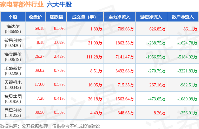 个股表现方面,家电零部件行业当日领涨股为海达尔(836699),该股当日报收69.18,上涨8.3%,成交量1.8万,主力资金净流入709.66万元。毅昌科技(002420)以上涨3.02%紧随其后,该股当日成交量31.9万,主力资金净流入1863.53万元。除此之外,海立股份(600619)、禾盛新材(002290)、天银机电(300342)均进入当日牛股之列。具体个股列表见下表: