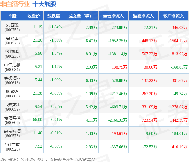 个股表现方面,非白酒行业当日领跌股为ST西发(000752),该股当日报收11.19,下跌1.84%,成交量2.89万,主力资金净流出273.88万元。会稽山(601579)以下跌1.35%紧随其后,该股当日成交量6.47万,主力资金净流出1952.25万元。除此之外,*ST椰岛(600238)、中信尼雅(600084)、金枫酒业(600616)均进入当日熊股之列。具体个股列表见下表: