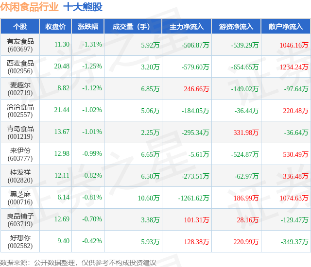个股表现方面,休闲食品行业当日领跌股为有友食品(603697),该股当日报收11.3,下跌1.31%,成交量5.92万,主力资金净流出506.87万元。西麦食品(002956)以下跌1.25%紧随其后,该股当日成交量3.2万,主力资金净流出579.6万元。除此之外,麦趣尔(002719)、洽洽食品(002557)、青岛食品(001219)均进入当日熊股之列。具体个股列表见下表: