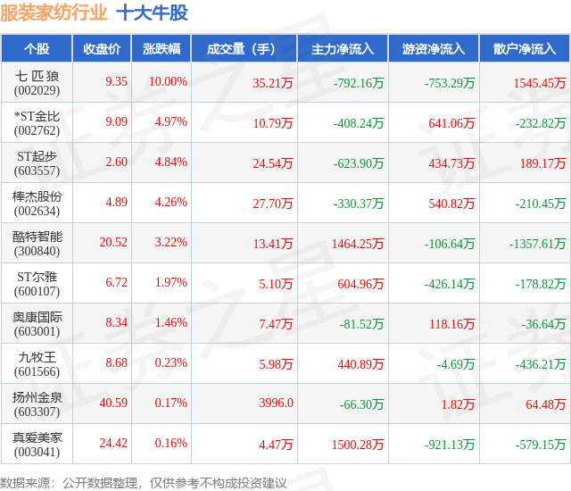 个股表现方面,服装家纺行业当日领涨股为七 匹 狼(002029),该股当日报收9.35,上涨10.0%,成交量35.21万,主力资金净流出792.16万元。*ST金比(002762)以上涨4.97%紧随其后,该股当日成交量10.79万,主力资金净流出408.24万元。除此之外,ST起步(603557)、棒杰股份(002634)、酷特智能(300840)均进入当日牛股之列。具体个股列表见下表: