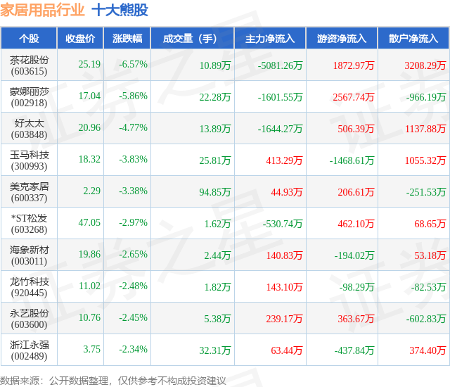 个股表现方面,家居用品行业当日领跌股为茶花股份(603615),该股当日报收25.19,下跌6.57%,成交量10.89万,主力资金净流出5081.26万元。蒙娜丽莎(002918)以下跌5.86%紧随其后,该股当日成交量22.28万,主力资金净流出1601.55万元。除此之外,好太太(603848)、玉马科技(300993)、美克家居(600337)均进入当日熊股之列。具体个股列表见下表: