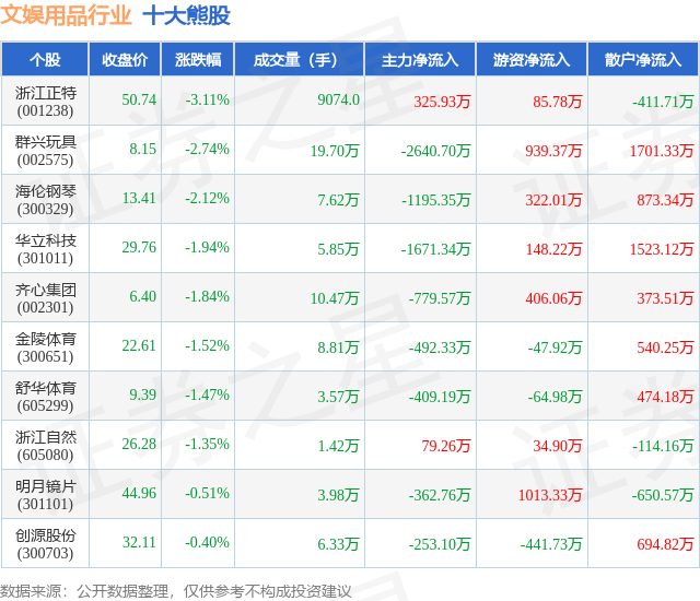 个股表现方面,文娱用品行业当日领跌股为浙江正特(001238),该股当日报收50.74,下跌3.11%,成交量9074.0,主力资金净流入325.93万元。群兴玩具(002575)以下跌2.74%紧随其后,该股当日成交量19.7万,主力资金净流出2640.7万元。除此之外,海伦钢琴(300329)、华立科技(301011)、齐心集团(002301)均进入当日熊股之列。具体个股列表见下表: